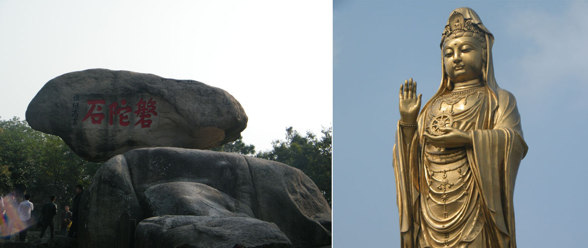島四周金沙綿亙、白浪環(huán)繞,漁帆競(jìng)發(fā),青峰翠巒、銀濤金沙環(huán)繞著大批古剎精舍,構(gòu)成了一幅幅絢麗多姿的畫卷,給人完美的視覺體驗(yàn)。巖壑奇秀,磐陀石、二龜聽法石、心字石、梵音洞、潮音洞、朝陽洞各呈奇姿,引人入勝。