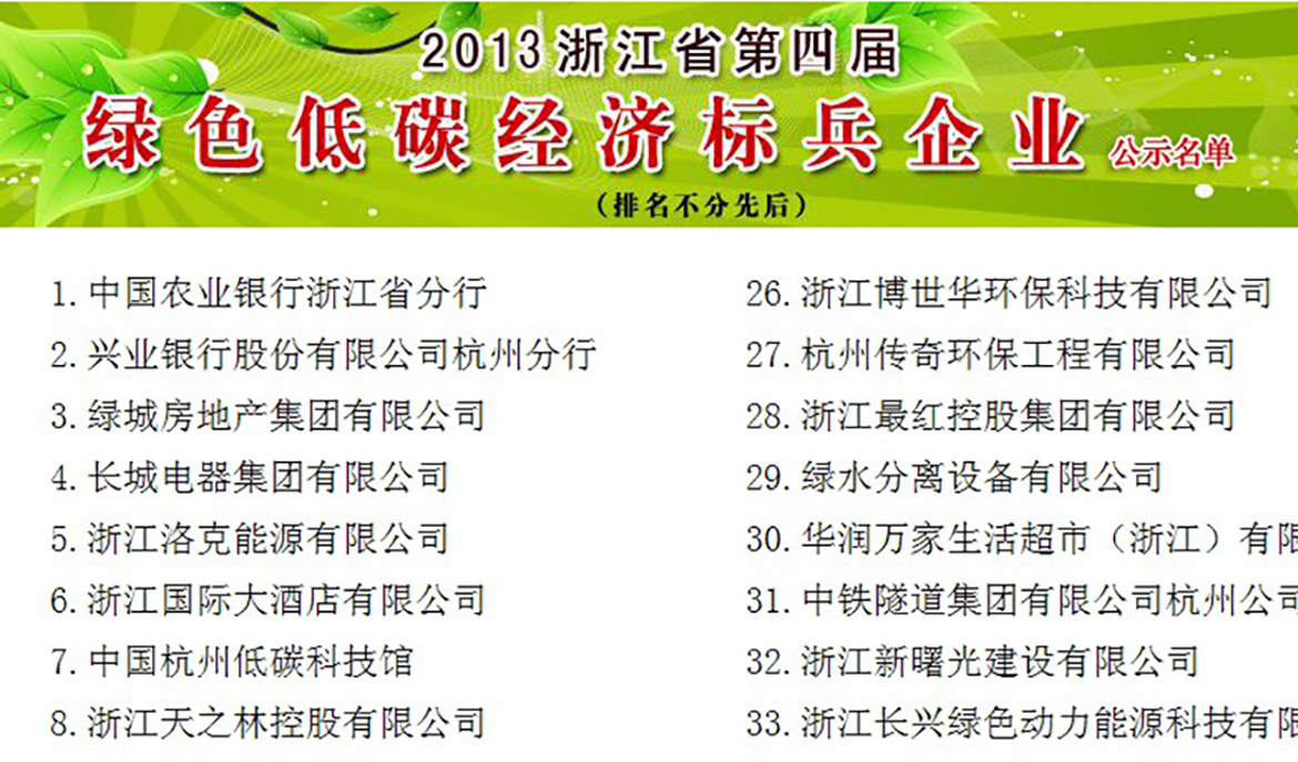 由錢江晚報、浙江在線新聞網站、浙江大學經濟學院、浙江省企業發展研究會聯合主辦的浙江省第四屆“綠色低碳經濟標兵企業”評審會于2013年11月17日落幕,經全體評委評審和無記名投票,在眾多入圍企業中選拔我省50家第四屆“綠色低碳經濟標兵企業”公示名單,我公司榮膺50家公示名單之內。