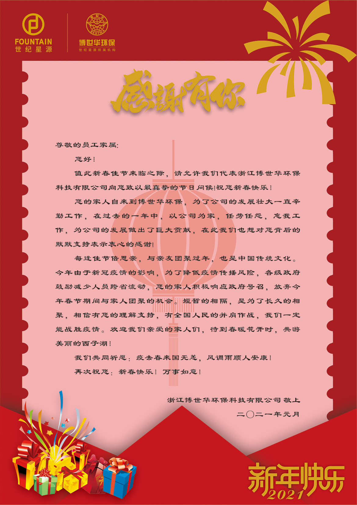 辛丑年春節將至,由于新冠疫情的影響,為了降低疫情傳播風險,各級政府鼓勵減少人員跨省流動。為了更好配合疫情防控工作,浙江博世華環保科技有限公司積極響應國家號召,在認真做好疫情防控部署的同時,開展了一系列豐富多樣的關愛活動,鼓勵支持員工春節期間留杭、留項目當地過節,讓員工感受到“家”的溫暖: